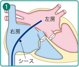 ①大腿静脈からシースを挿入し、ASDを越えてシースを左房側へ挿入する