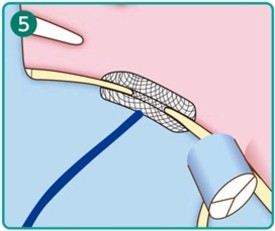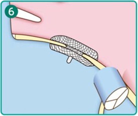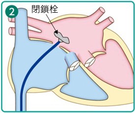 ②閉鎖栓を左心房にあるカテーテルの先端まで進めて、左心房側のディスクを開く